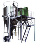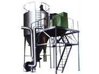 空氣經過濾和加熱,進入干燥器頂部空氣分配器,熱空氣呈螺旋狀均勻地進入干燥室。料液經塔體頂部的高速離心霧化器,(旋轉)噴霧成細微的霧狀液珠,與熱空氣并流接觸在短的時間內可干燥為成品。成品連續地由干燥塔底部和旋風分離器中輸出,廢氣由風機排空。
